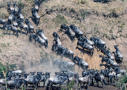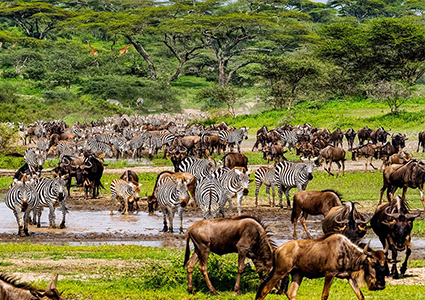 After an early breakfast, depart towards the most famous National park in the World, the Serengeti. The driving itself, although long, is spectacular. You will drive up the crater highlands, making a quick stop at the rim for an out of this world view of Ngorongoro Crater. This will be an unforgettable moment for anyone seeing it for the first time. As you progress well into the Serengeti, you will see why the name means, in local language, “endless plains”. The park has 6,900 sq. mile (18,000 sq. km) and for most of it, the plains will stretch to the horizon defying your senses and perception of distances. It is the home of the Great Migration and to 2 million wildebeests, hundreds of thousands of zebras and all kinds of antelopes including the abundant impalas and Thomson’s gazelles. As for Big Cats and large predators, it’s the place of choice to look out for lions, cheetahs, leopards, hyenas, with many television scenes like the famous river crossings having been filmed in this park. Smaller animals like foxes, mongoose, honey badgers, jackals, monkeys, baboons, rock hyrax and african hares, together with more than 500 species of birds, also inhabit this park.